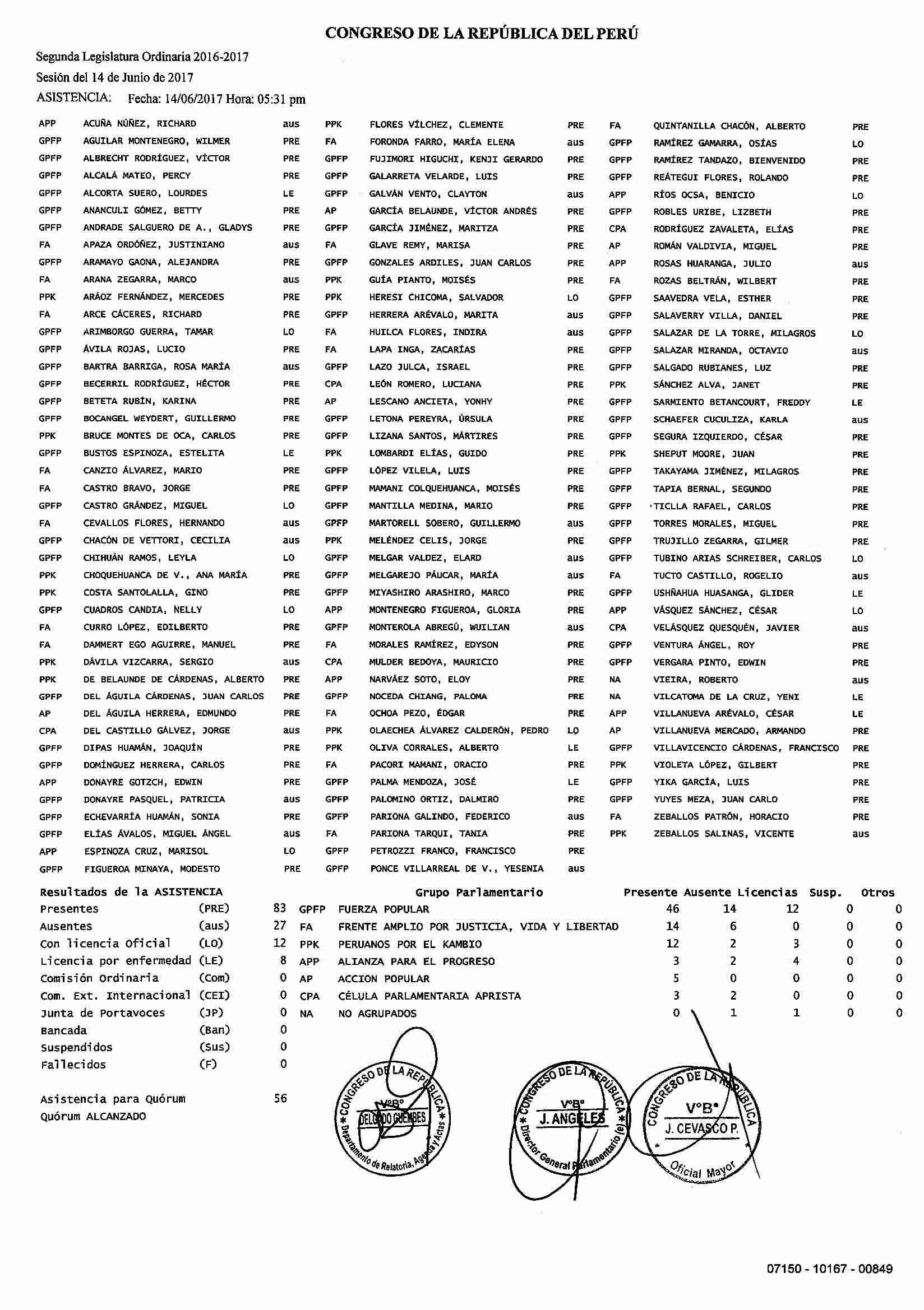 La figura abajo contiene un listado de asistencia de la sesión plenaria del Congreso de Perú llevada a cabo el 14 de junio de 2017. En total, el documento contiene 9 páginas de asistencia y otras 9 conteniendo votaciones. Infelizmente, el pdf está escaneado y solo podemos acceder a imágenes. Como tarea previa, he llevado a cabo el reconocimiento de caracteres (OCR). Pero aún así, hace falta convertir los datos en una tabla que podamos analizar.