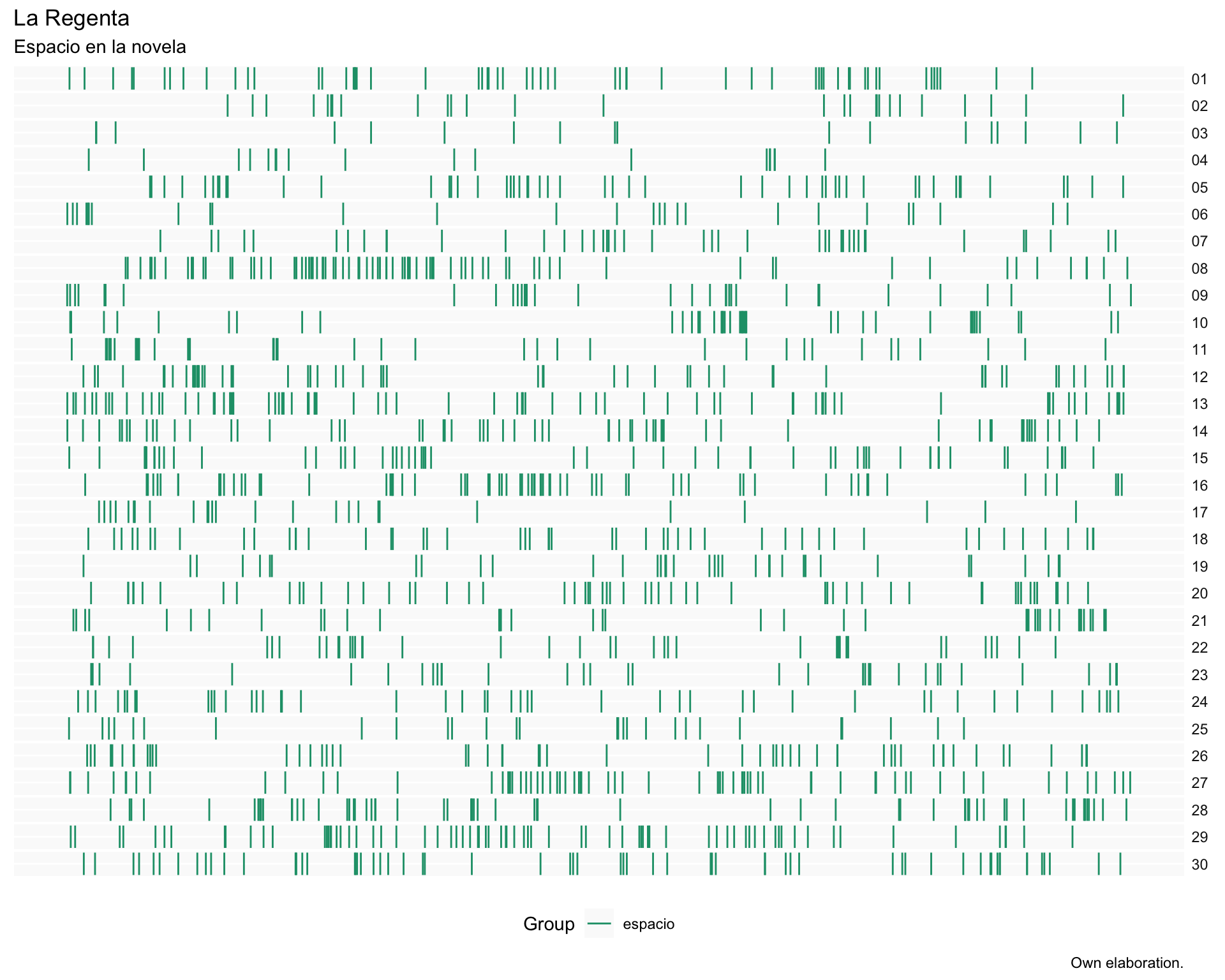 Ahora, los patrones quedan mucho más evidentes. Los espacios religiosos se destacan en los dos primeros capítulos de forma clara, así como en el capítulo 23. Además, es ahí donde termina la novela. Los ambientes domésticos, predominantes en los pasajes dedicados a la interacción con Ana, que se alternan con los espacios “sociales” en los que se desenvuelve la vida de la ciudad y de los demás personajes.