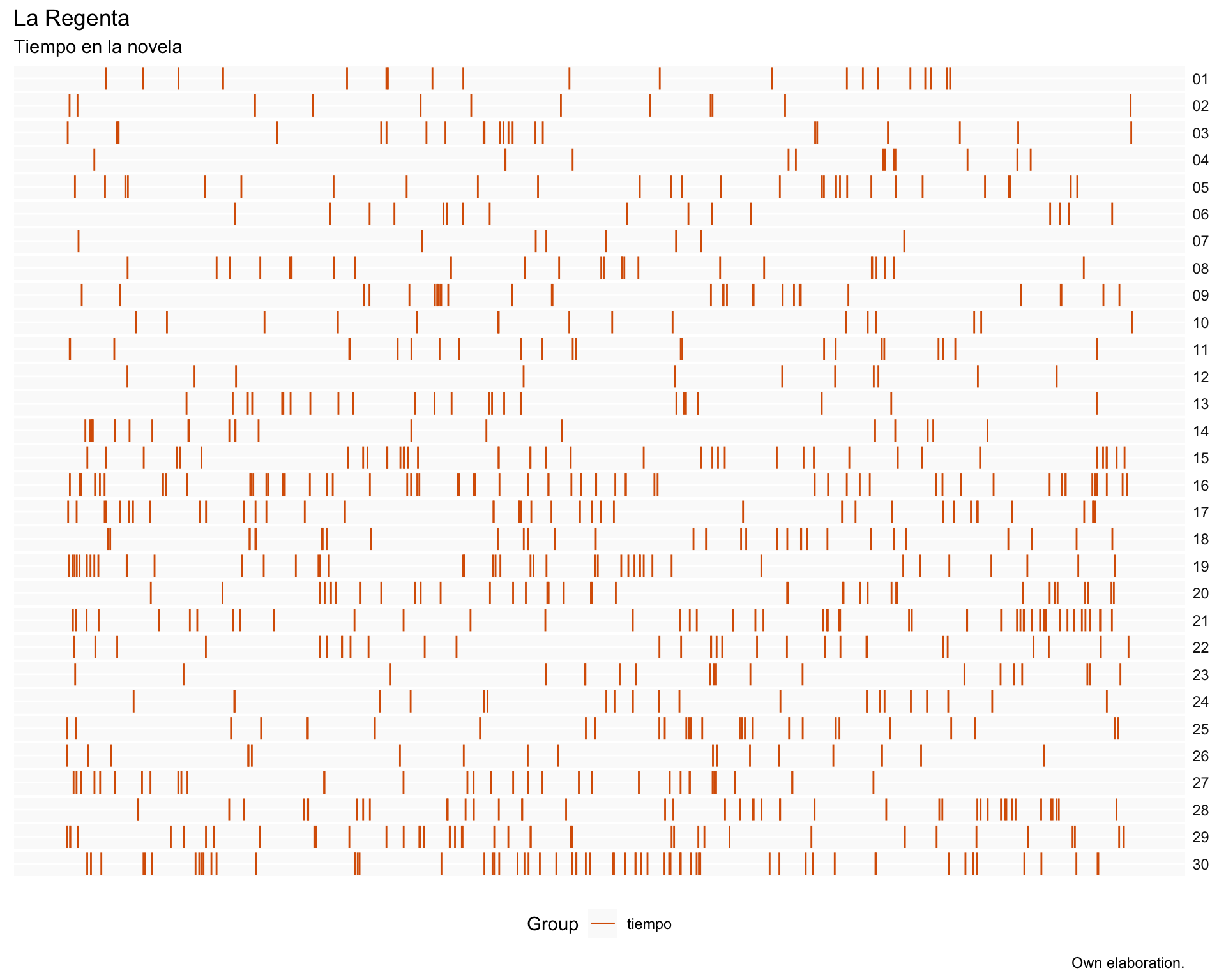Esta escala se podría interpretar de distintas maneras. Una de ellas es que los capítulos situados más a la izquierda representan una mayor intensidad de la vida social de Vetusta, mientras que aquellos más a la derecha se relacionan con la vida privada, íntima y la infancia de La Regenta.