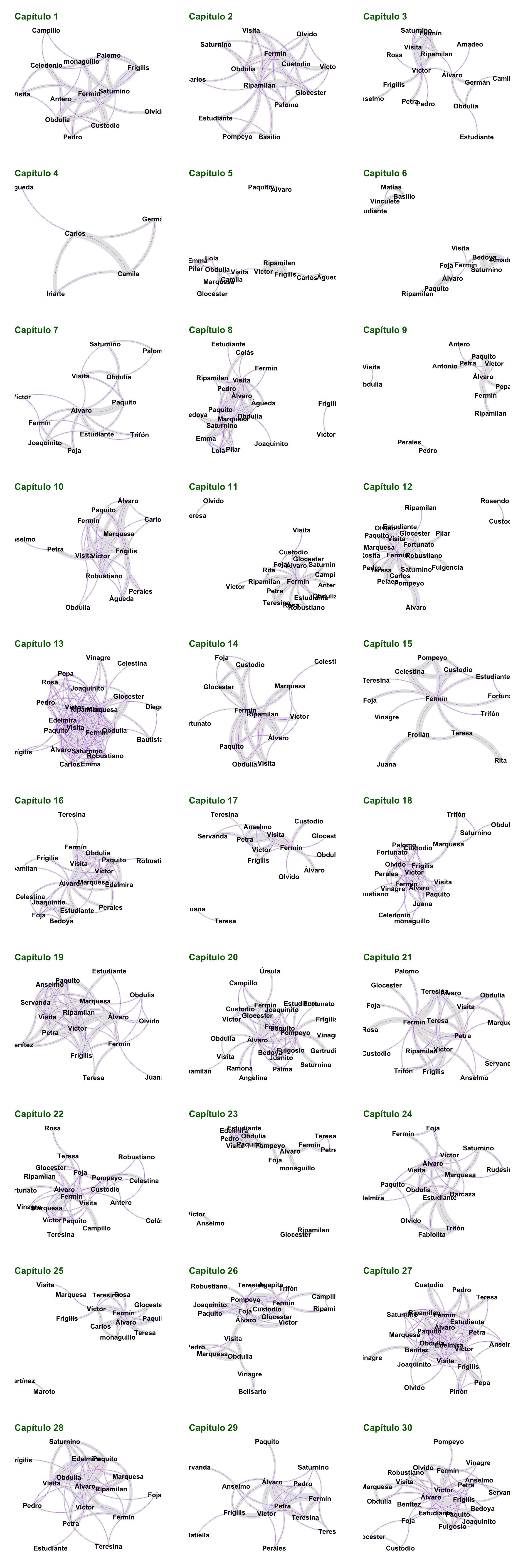 # Carga los paquetes necesarioslibrary(network)library(sna)library(ggnetwork)library(ggplot2)# Crea una lista para guardar# los gráficos de red# de cada capítulopx <-list()# Para cada capítulofor(i in1:30){# Extrae el texto del capítulo c1 <- cp[i]# Reorganiza en párrafos c1 <-corpus_reshape(c1, to="paragraphs")# Calcula la frecuencia de los# personajes d1 <-matchCodes(c1, dic.per, level =2, quietly=TRUE)# Elimina a Ana para facilitar# la visualización d1 <- d1[d1$term1!="Ana",] d1 <- d1[d1$term2!="Ana",]# Ordena los resultados d1 <- d1[order(d1$value, decreasing = T),]# Crea una red n1 <-network(d1, directed = F)# Convierte en un layout# de red para la visualización gn <-ggnetwork(n1, layout ="kamadakawai", cell.jitter =0.75)# Genera el gráfico p <-ggplot(gn, aes(x = x, y = y, xend = xend, yend = yend)) +geom_edges(color ="grey90",aes(size=value), curvature=0.25) +geom_edges(size=0.1, curvature=0.25, color="purple") +geom_nodetext(aes(label = vertex.names),fontface ="bold")+theme_blank()+labs(title=paste0("**Capítulo ",i,"**"))+theme(plot.title = ggtext::element_markdown(size=15, color="darkgreen"), legend.position ="none",plot.margin=grid::unit(c(0.75,0.75,0.75,0.75), "cm"))# Almacena el gráfico en# la lista px[[i]] <- p}# Carga el paquete que# permitirá visualizar# las 30 redes en un# solo gráficolibrary(egg)# Organiza los gráficos# en tres columnas y diez# filasggarrange(plots=px, ncol=3, nrow=10)