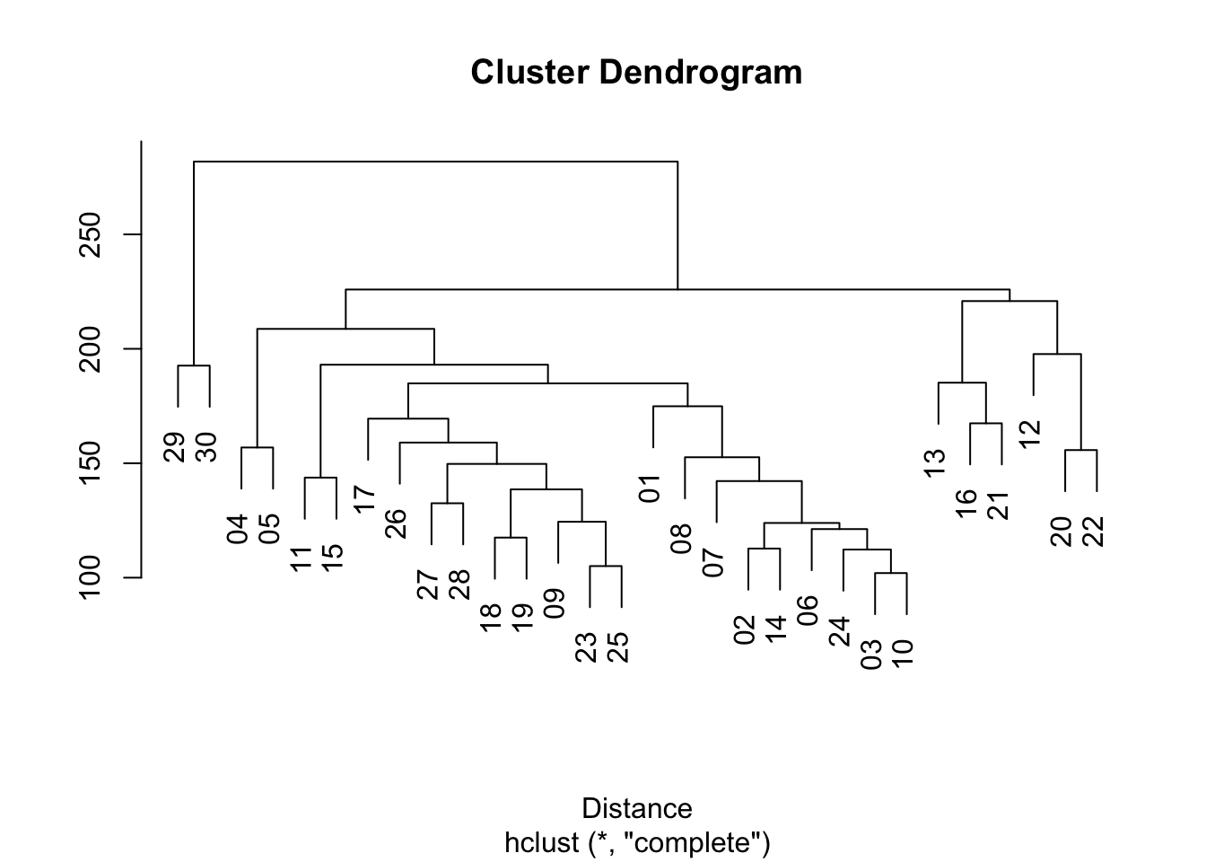 El dendrograma representa una forma de representación visual de las distancias entre los capítulos. Vemos existe un gran grupo de capítulos (con sus subgrupos) y dos conglomerados más pequeños. Uno, formado por los capítulos 12, 13, 16, 20, 21 y 22 y, otro, por el 29 y 30.