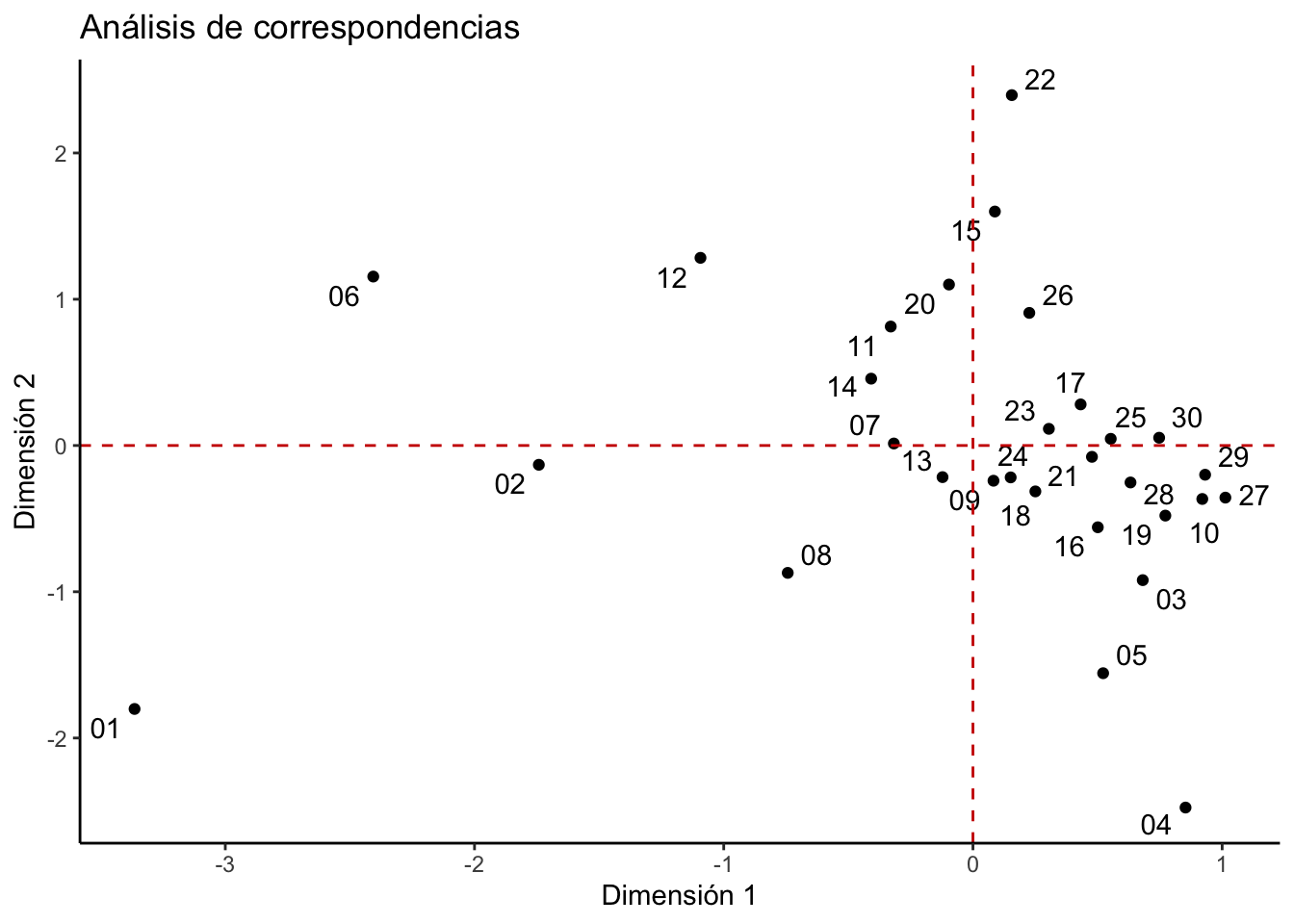 # Carga los paqueteslibrary(quanteda.textmodels)library(ggplot2)library(ggrepel)# Ejecuta el análisis de correspondenciascca <-textmodel_ca(dtm)# Extrae las coordenadas de los capítulosdd <-data.frame(cca$rowcoord)dd$name <-as.character(rownames(dd))dd <- dd[, c("name", "Dim1", "Dim2")]# crea un gráfico de dispersión # para examinar los resultadosggplot(dd, aes(x = Dim1, y = Dim2)) +geom_point() +geom_text_repel(aes(label = name)) +theme_classic() +theme(legend.position ="none")+geom_hline(yintercept =0, color ="red3", linetype ="dashed") +geom_vline(xintercept =0, color ="red3", linetype ="dashed")+xlab("Dimensión 1") +ylab("Dimensión 2") +labs(title ="Análisis de correspondencias")