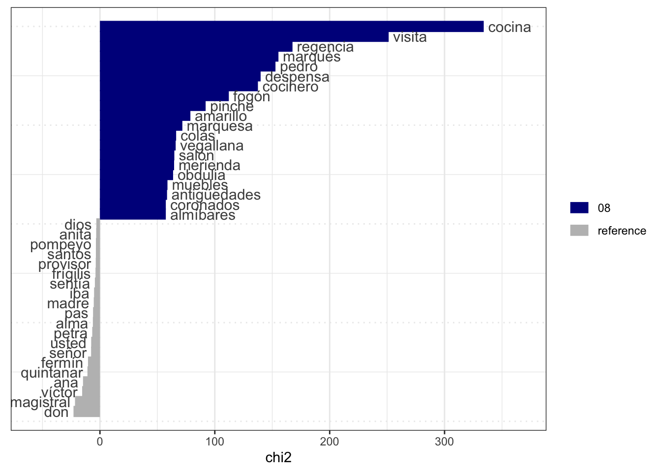 El capítulo 8 de la novela es una delicia para emplear esa técnica. Se trata de un pasaje que contiene la descripción de una merienda en la casa de la marquesa de Vegallana y sus “preparativos” en la cocina. Emplearemos la función textstat_keyness del paquete quanteda.textstats para encontrar las palabras clave.
