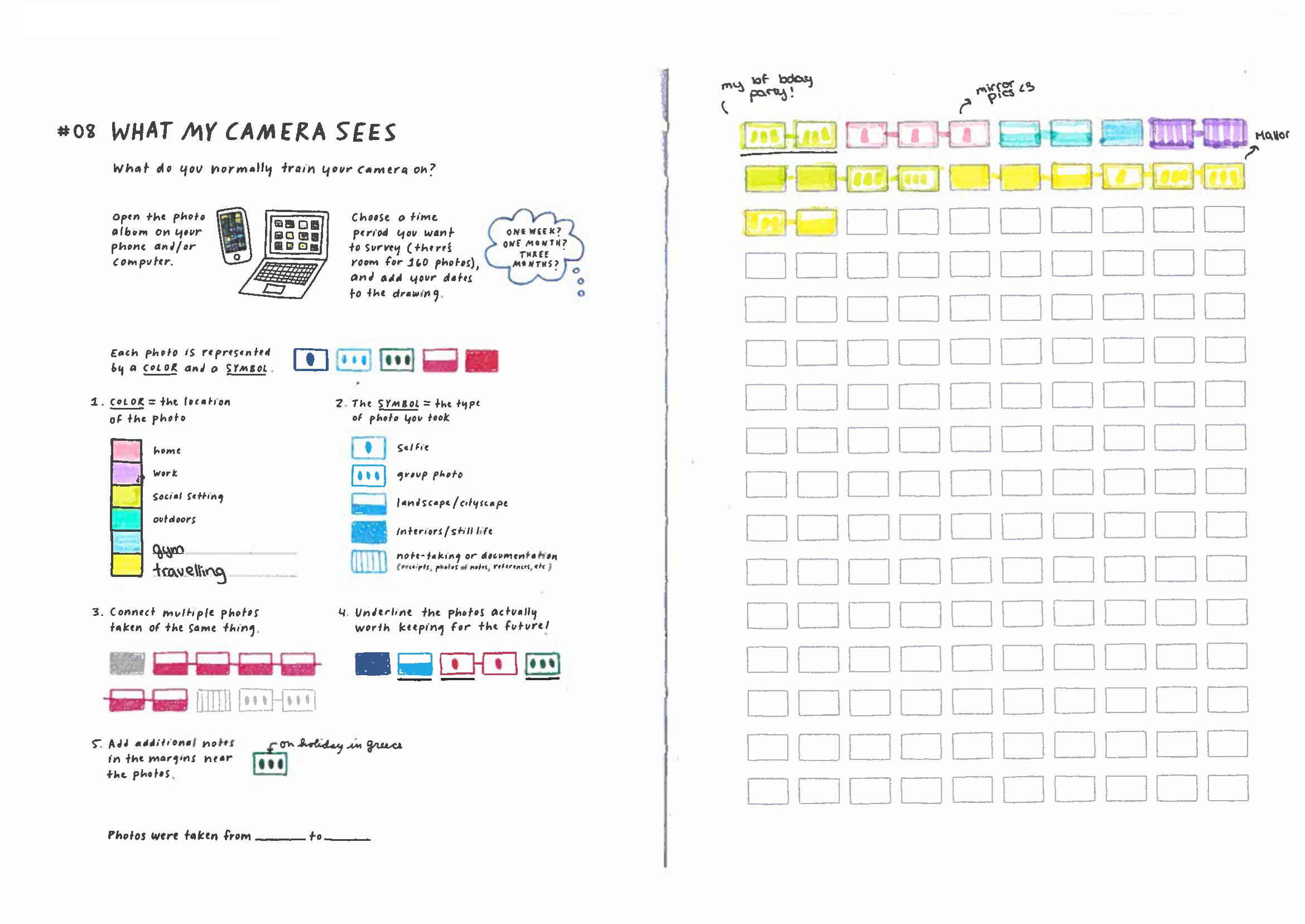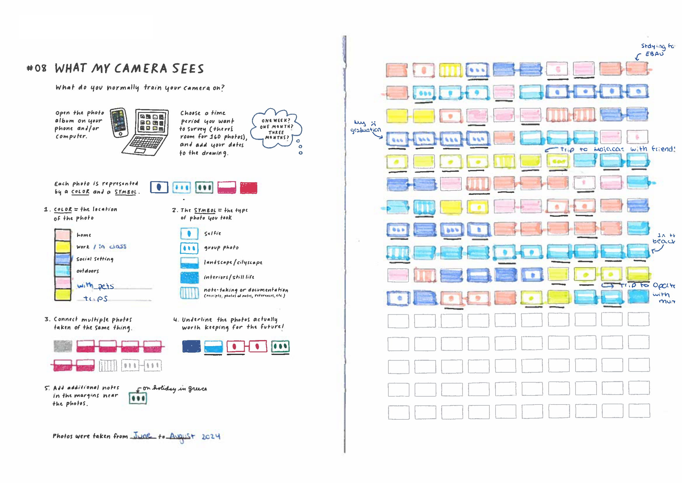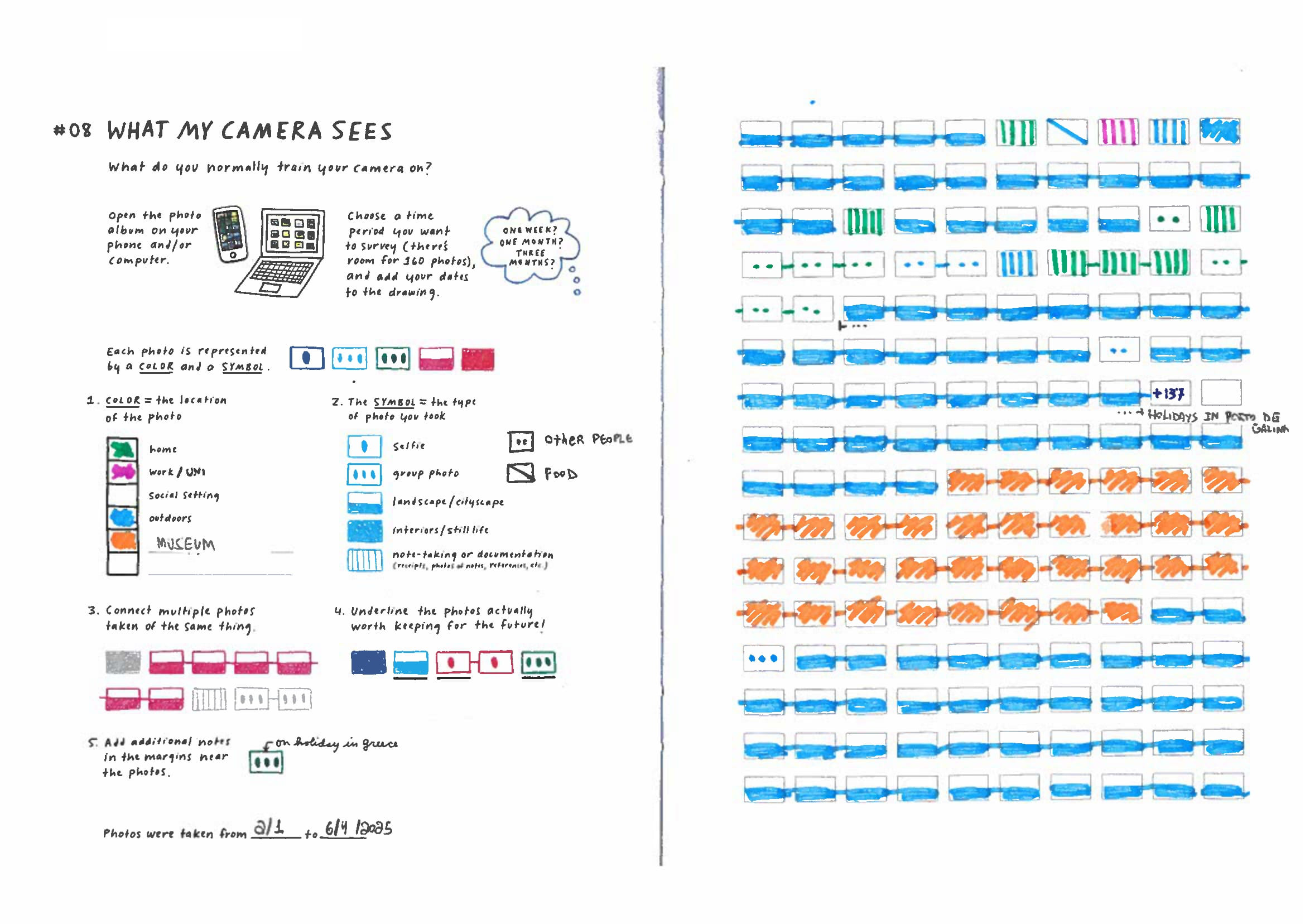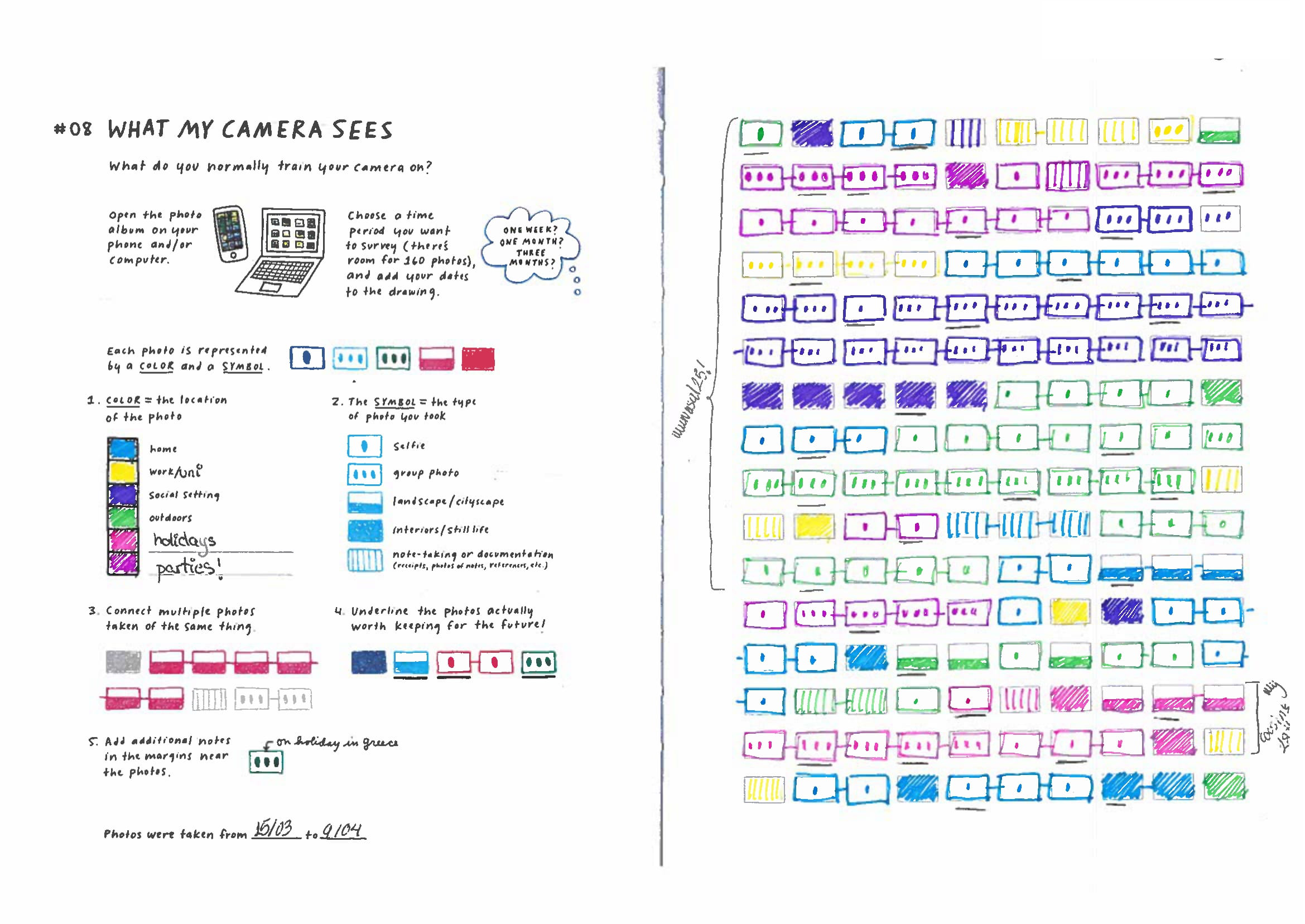 En una de las sesiones de mi asignatura de metodología, he decidido aplicar un ejercicio de visualización de datos creado por Giorgia Lupi y Stefanie Posavec llamado “Lo que ve mi cámara” (What my phone sees). El ejercicio consiste en que los estudiantes deben analizar las fotos que han tomado con su teléfono móvil durante un período de tiempo determinado (un mes, tres meses, etc.) y representarlas en una cuadrícula siguiendo ciertas instrucciones. El objetivo es que los estudiantes reflexionen sobre sus hábitos de uso del teléfono y cómo estos reflejan aspectos de su vida cotidiana.